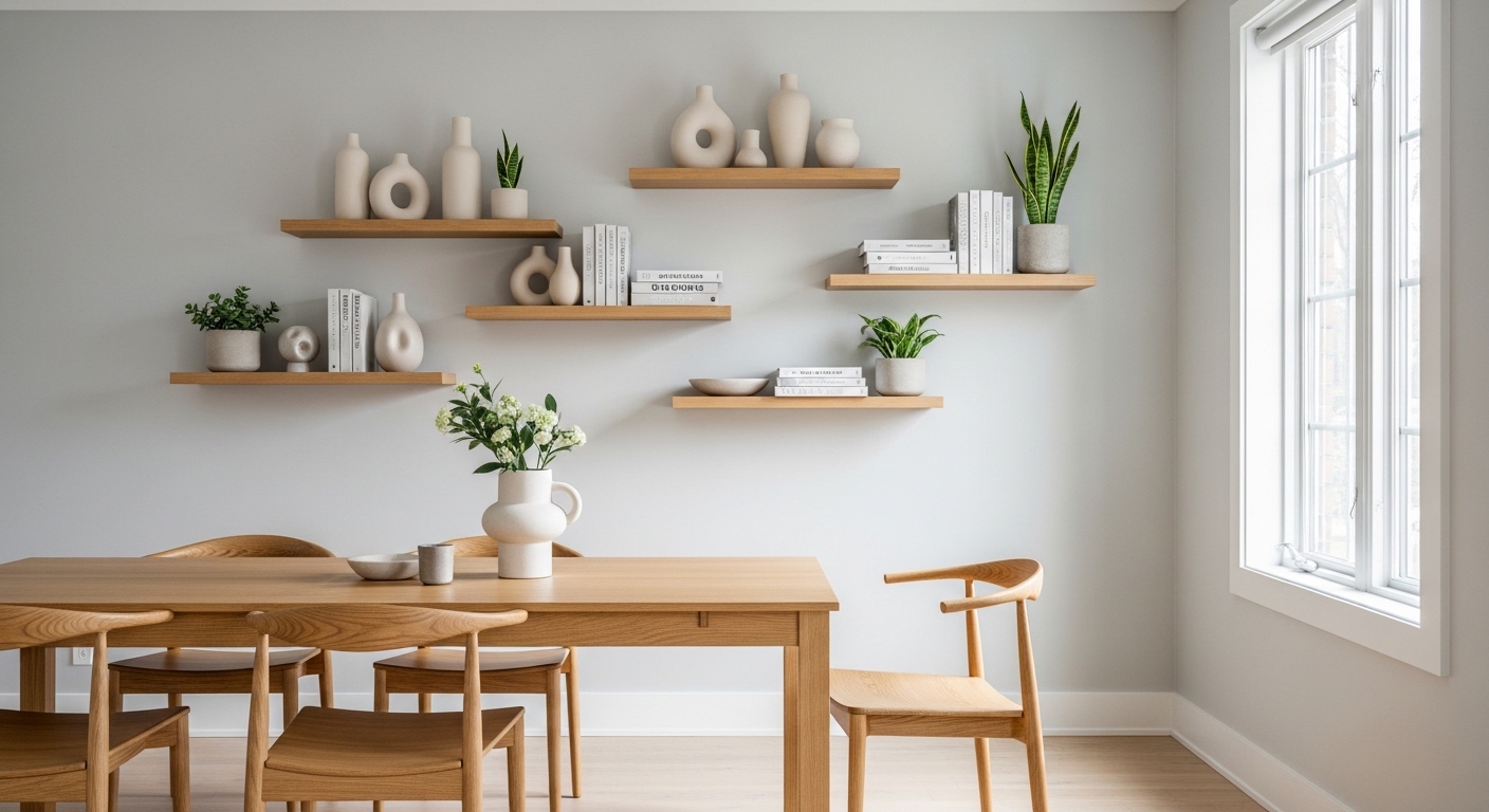 Floating shelves aren’t just practical—they’re a styling opportunity.