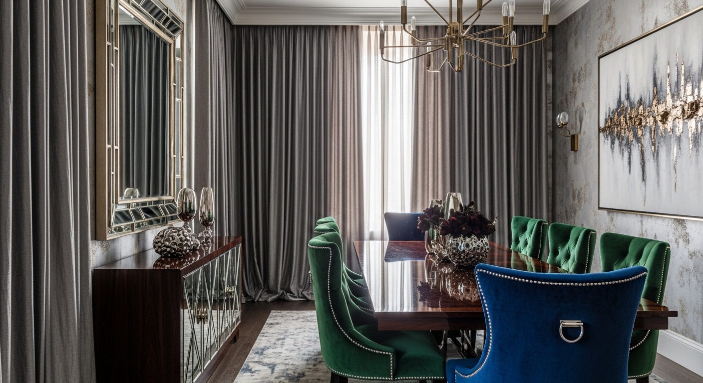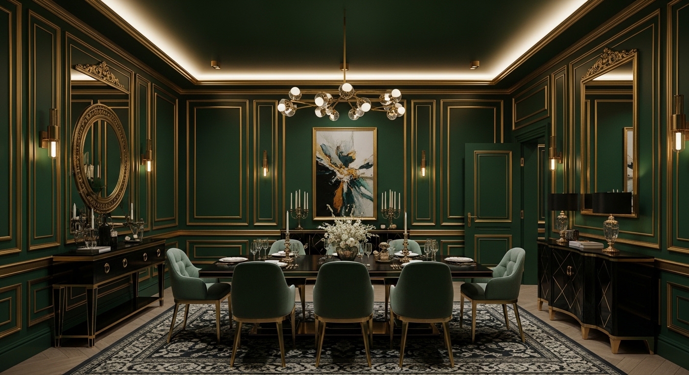 Luxury dining rooms aren’t afraid of bold or moody tones.