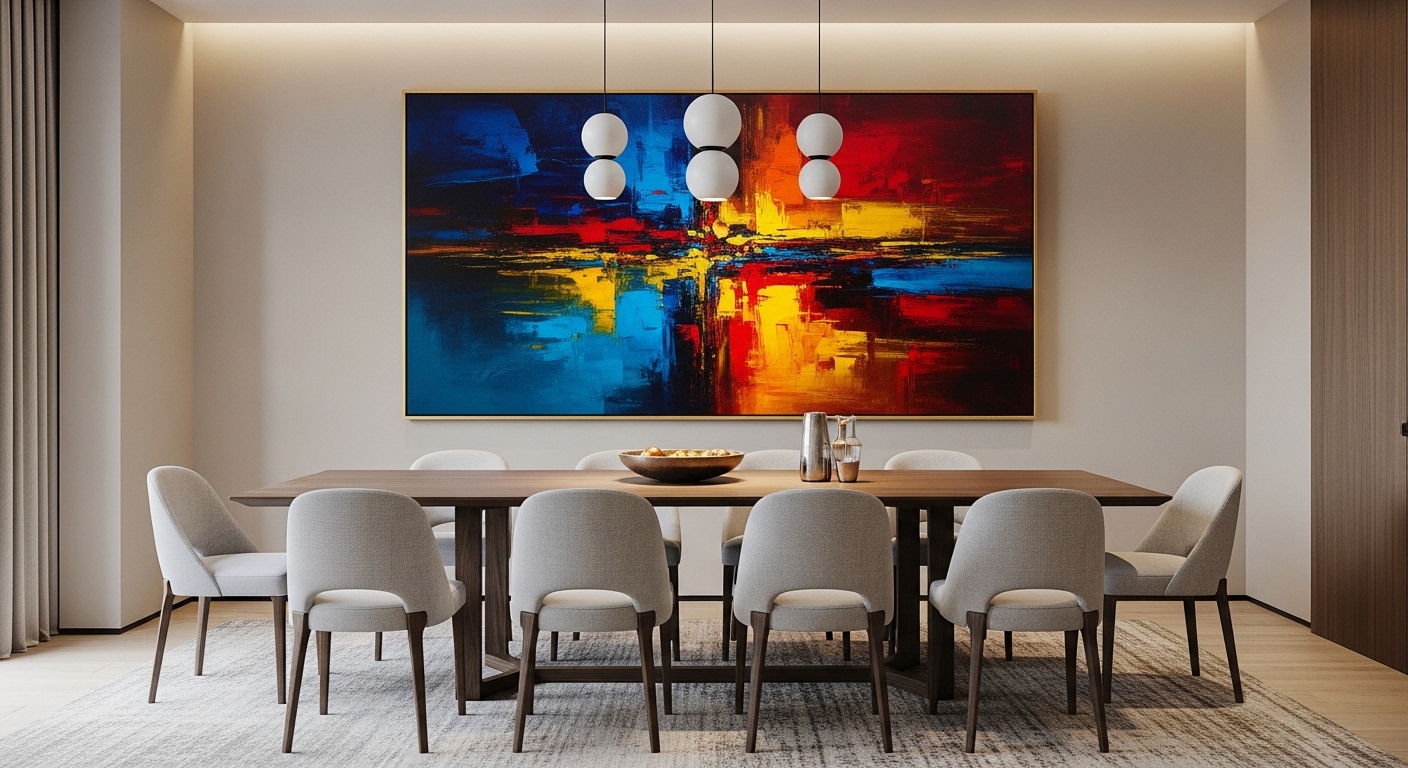 Empty walls are a missed opportunity. Luxury dining rooms always feature impactful artwork.